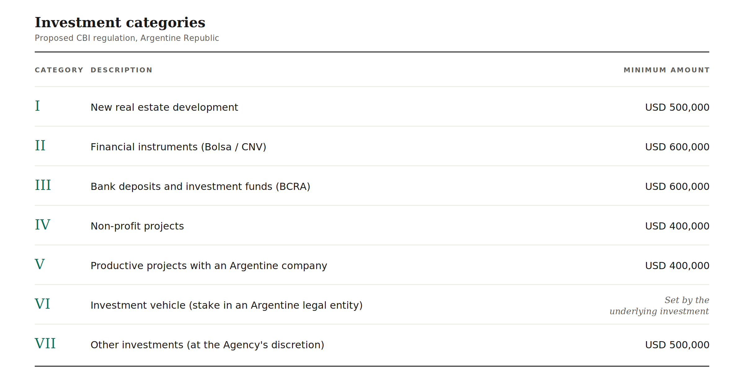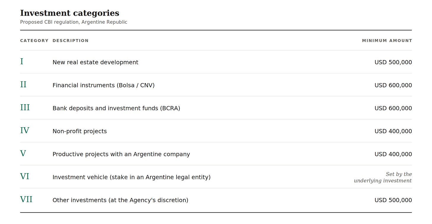 The category structure does the work that a well-designed program should do. It pulls capital toward new construction and productive projects (lower thresholds for joint ventures with Argentine companies and non-profits) and away from passive secondary-market real estate flips.