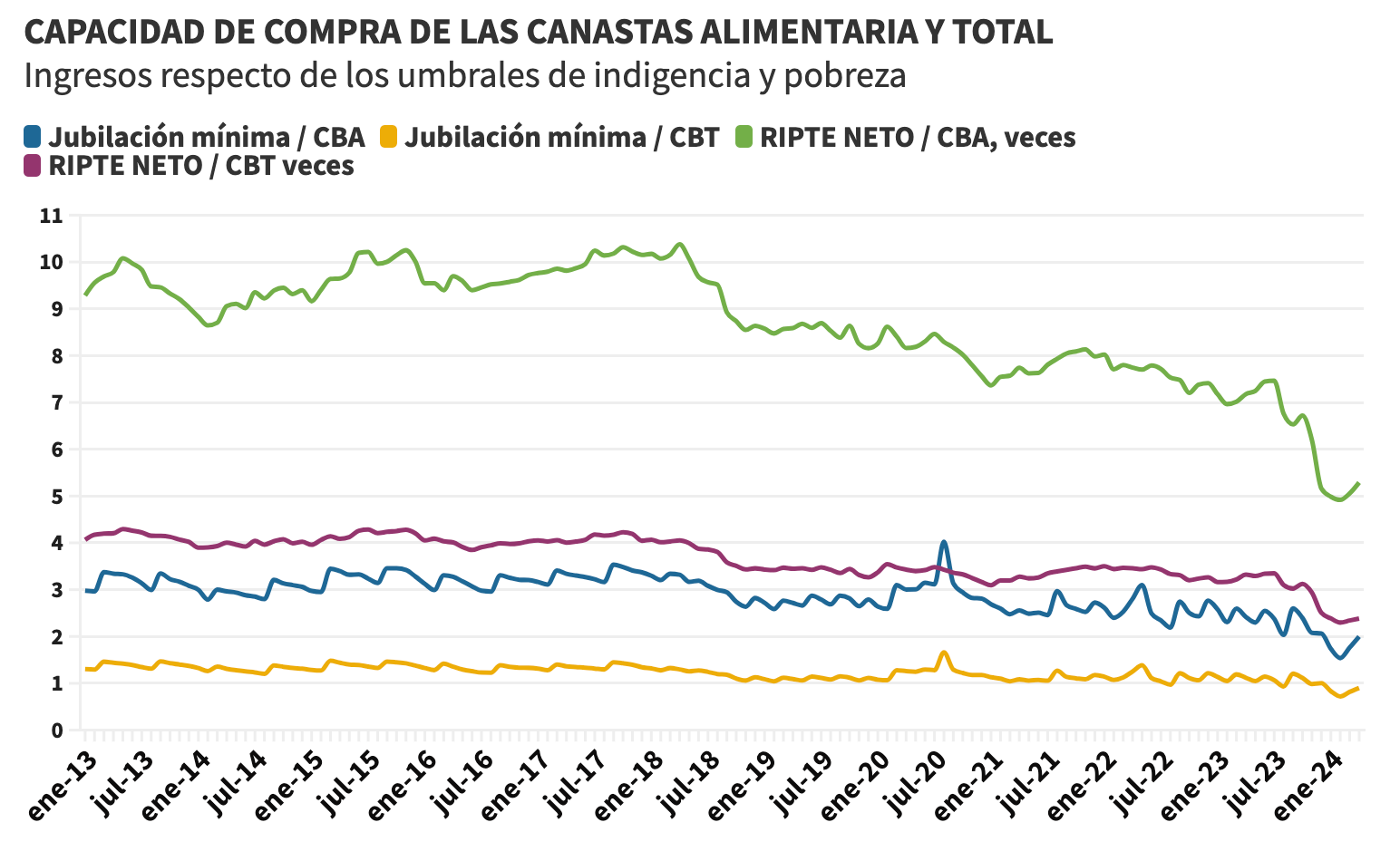 When looking at minimum pensions historically since 2013 in terms of purchasing power for the basic food basket, it’s clear that depending on any government pension or minimum wage has been a losing battle in Argentina for a while now: